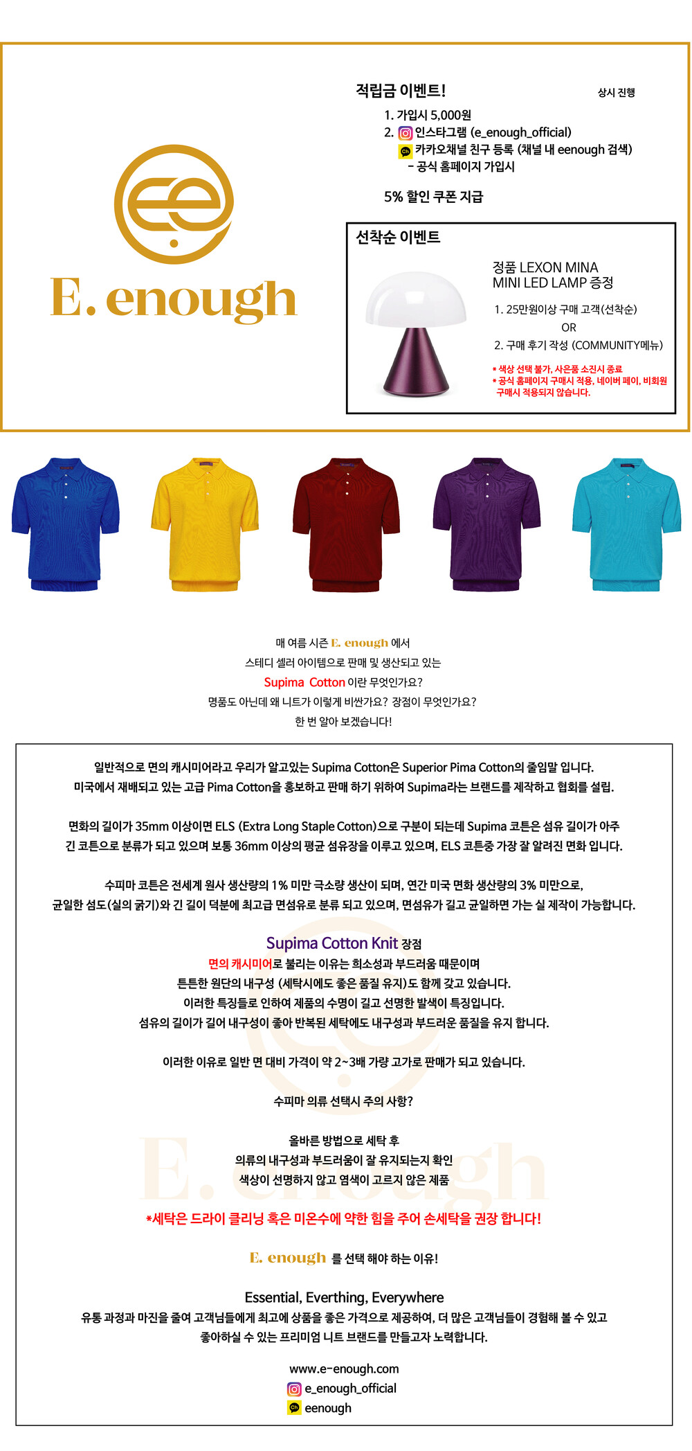- E. enough 에서 판매되고 있는 모든 상품은 온·오프라인 동시에 판매되고 있는 상품으로, 품절 및 발송지연이 될 수 있음을 양해하여 주시기 바랍니다.